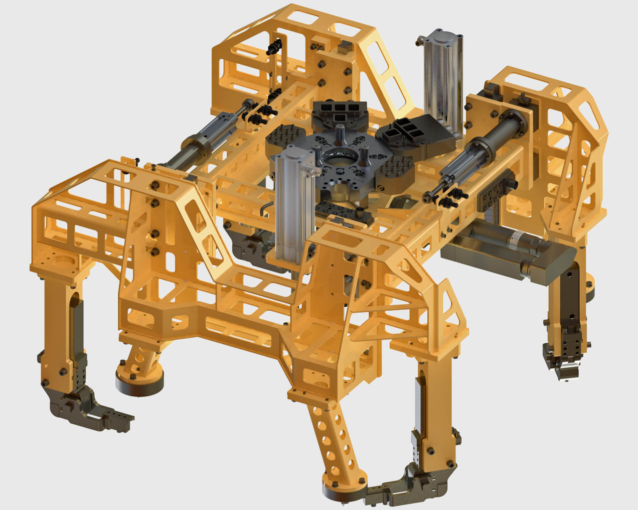 Die einzelnen Elemente werden über pneumatisch zustellbare Stifte positioniert und mittels Robotern verschweißt.